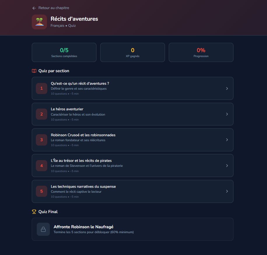 Accédez à tous les chapitres de Maths, Physique, Histoire, Français, et plus. Chaque matière avec son boss légendaire à vaincre.